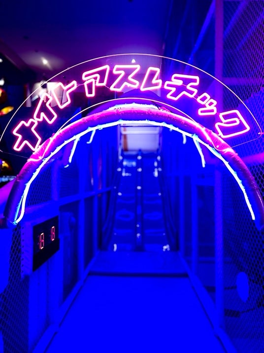 ネオンチューブが輝く中、スライダーで滑り抜けよう!
