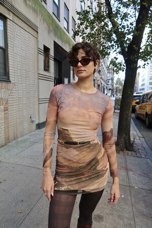 チュール生地で作られたタイトフィットのワンピースになっており、アースカラーで空と山のモチーフがプリントされています。23AWシーズン、ストリートやランウェイにて、Tシャツやストレッチドレスの形で見かけたメッシュ素材のトレンドを、テイラーは見事に着こなしています。デシグアル・コレクションには他のアイテムでもこのトレンドが見られ、Y2Kの美学に現代的なひねりを加えている商品が多くみられます。このデザインは今シーズンのもうひとつのトレンドである、幻想的な風景の写真プリントとも融合しています。