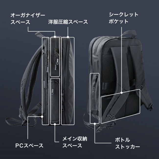 さらに、止水ファスナー付きのポケットや、隠れるボトルストッカー、貴重品を入れるシークレットポケットなど、かゆいところに手が届く、こだわりの機能が充実しています。
