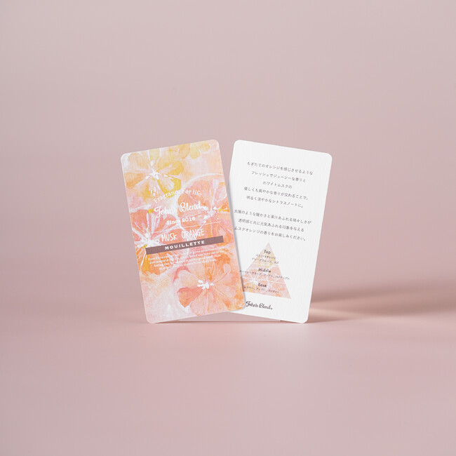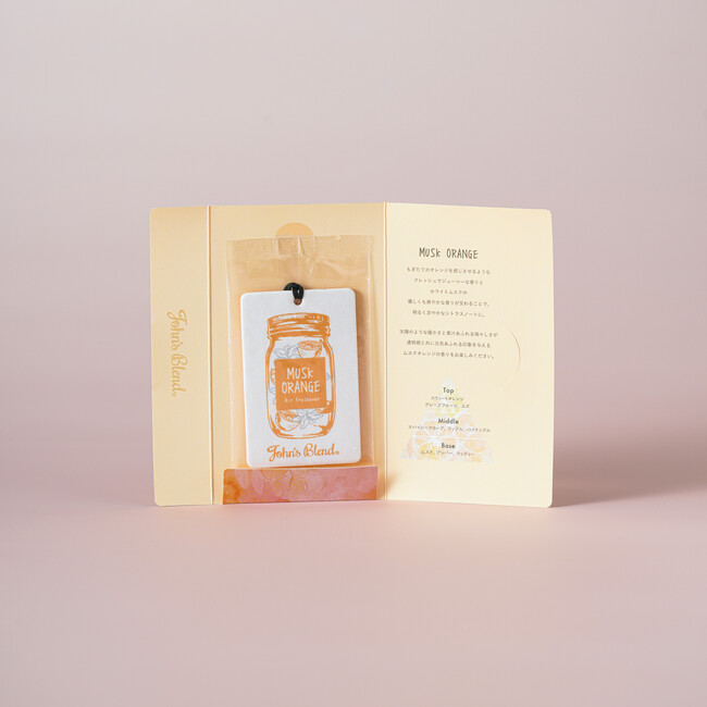 誰もが馴染みのある柑橘系の香りだからこそ、「オレンジ」のイメージをしっかりと感じることができ、その中にしっかりとJohn's Blendの息吹を感じ取れるようにホワイトムスクの特徴をきれいに溶かし込んでいます。