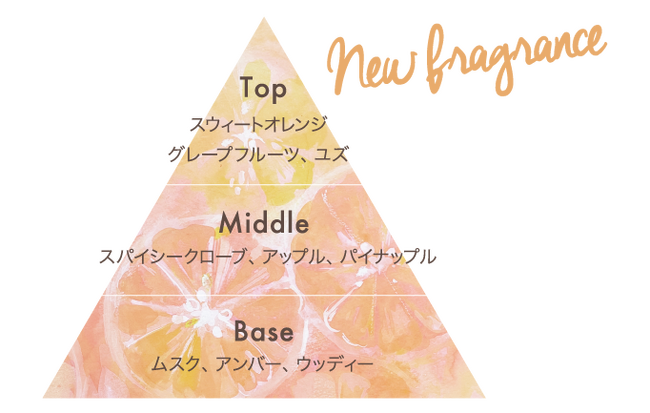 もぎたてのオレンジを感じさせるようなフレッシュでジューシーな香りとホワイトムスクの優しく爽やかな香りが交わることで、明るく涼やかなシトラスノートに。