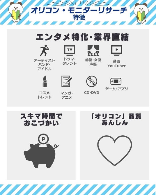 オリコン・モニターリサーチは、エンタメ特化・業界直結のアンケート調査サービスです。自社モニターを活用し、旬のアーティストや俳優、アナウンサー、ドラマに関するランキングなど、エンタメ調査を展開しています。また、生活意識やトレンドの調査、アーティストのファン分析など、企業向けのマーケティング調査も行っており、集計・分析されたデータは、音楽メーカーや芸能事務所といったエンタメ各社に届けられ、企画や商品開発などに活用されています。会員は調査に回答することでポイントを獲得することができ、ポイントはAmazonギフトカードに交換可能。音楽ランキングで50年以上の歴史を持つオリコン・グループが運営しているので、個人情報管理も万全です。