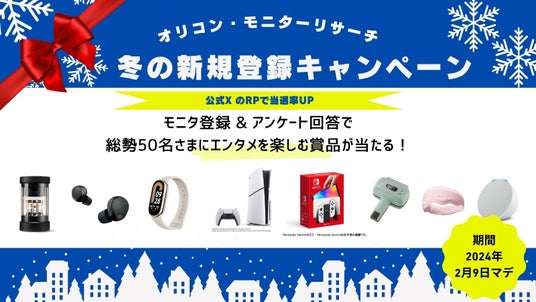 エンタメ調査サービス・オリコン・モニターリサーチ(運営:オリコン・リサーチ株式会社、本社:東京都港区、代表取締役社長:佐藤 直也)は、「冬の新規登録キャンペーン」を開催します。応募期間は2024年2月9日(金)まで。新規会員登録し、アンケートに回答した方から抽選で50名に賞品をプレゼントいたします。