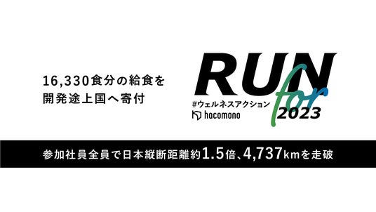 「ウェルネス産業を、新次元へ。」をミッションにウェルネス/運動施設向けオールインワン・マネジメントシステム「hacomono」を提供する株式会社hacomono(東京都渋谷区:代表取締役CEO 蓮田 健一)は、2023年11月9日(木)から12月10日(日)まで、社内企画「Run for #ウェルネスアクション」にて、社員のランニング消費200kcalにつき開発途上国の子どもに給食10食分を寄付する企画を実施し、累計消費 326,600カロリーにて、16,330食分の寄付を行いました。
