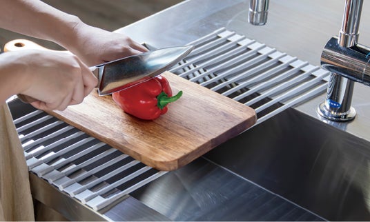 食材を切るためのスペースが足りない場合に、この水切りを使ってまな板を置き、調理台の拡張や切り終えた食材の一時保管に利用できます。