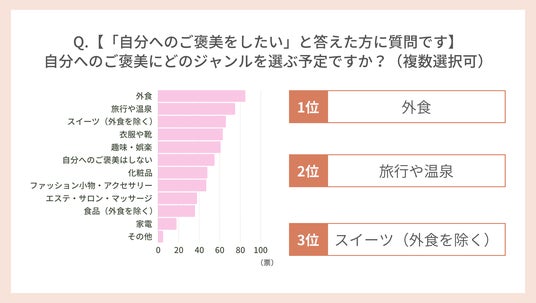 自分へのご褒美には「衣服や靴」61票や「趣味・娯楽」55票も僅差で選ばれていました。
