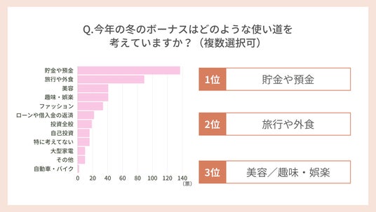 続いて「今年の冬のボーナスはどのような使い道を考えていますか?(複数回答可)」と尋ねたところ、もっとも多い回答は「貯金や預金」137票でした。