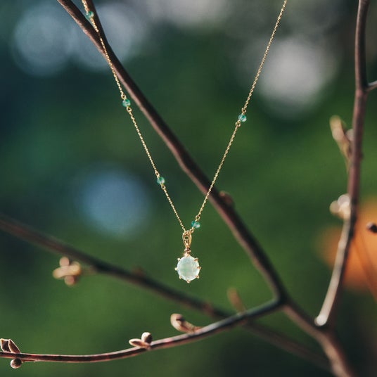 グリーンクォーツと白蝶貝のダブレットストーン*は植物が放つしなやかな生命力のように凛と輝き、まるで光を浴びて揺らめく水面のよう。