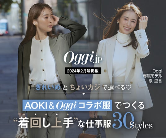 株式会社AOKI(代表取締役社長:森裕隆)は、この度女性ファッション誌『Oggi』(小学館発行)とコラボした全49アイテムを発売いたします。今回、『Oggi』の専属読者モデル「オッジェンヌ」の皆さまと、『Oggi』編集部にご協力いただき、働く女性のリアルなお声を反映したセットアップに加え、インナーも開発。2023年12月27日(水)に発売される雑誌『Oggi』本誌では、コラボアイテムを使用した30日間の着まわしをご紹介しております。本商品は、全国のAOKI店舗およびAOKI公式オンラインショップ( https://www.aoki-style.com/feature/oggi/ )にて、ご購入いただけます。
