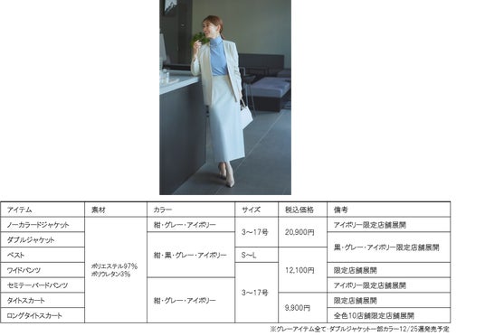 ジャケット2型、ベスト、パンツ2型、ロングタイトスカートを含むスカート2型とアイテムを豊富にご用意しております。4色展開で、シーンやなりたい雰囲気に合わせて自由にお召しいただけます。