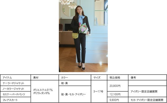 ジャケットはビジネスでも着用しやすい2型、ボトムはコンパクトシルエットで、きれいめを演出できるセミテーパードパンツと、華やか過ぎず上品さを演出できるフレアスカートの2種類をご用意。オーソドックスな紺・黒に加え、モカ・アイボリーを展開しておりオケージョンシーンにもお召しいただけます。