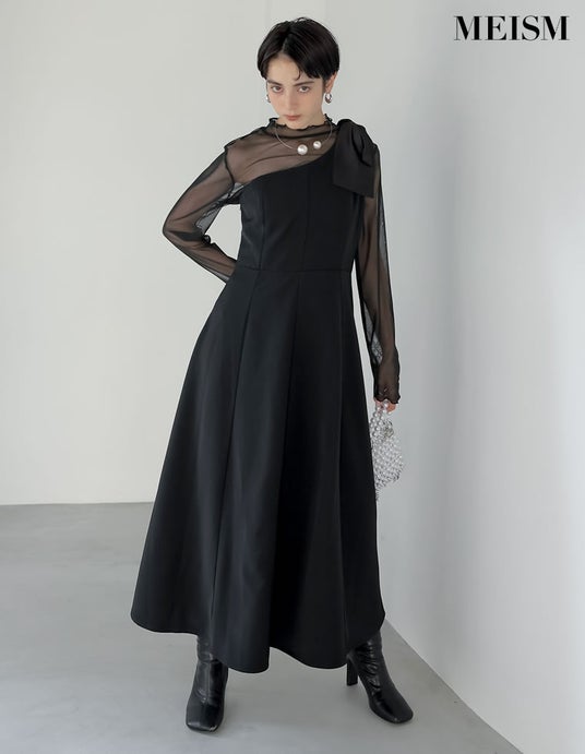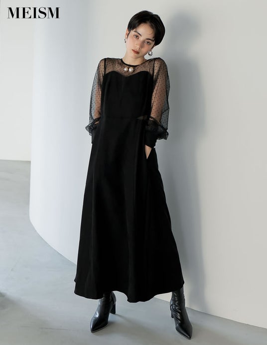 パフスリーブフロッキードットシアー切り替えフレアワンピース