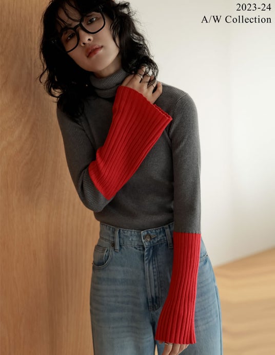 選べる2TYPE配色or無地フレアスリーブリブニットトップス