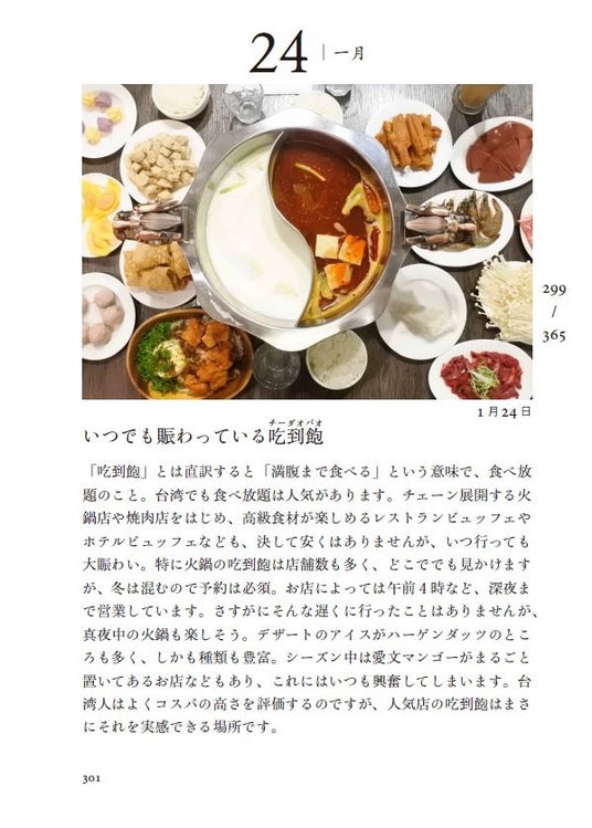 本書は、台湾で生活して以来、その魅力をブログやWEBサイトで発信し続けている著者が、生活の何気ない習慣、季節のできごと、大切にしている価値観など、ささやかな台湾の日々の暮らしを365日分、色彩豊かな写真とエピソードで綴ったエッセイ集です。旅をするだけでは見えてこない日常風景が垣間見えることで、ありのままの台湾気分を味わうことができます。懐かしさと新しさが入り交じる、どこかほっとする台湾の暮らしには、「幸せに生きるヒント」がたくさん詰まっています。