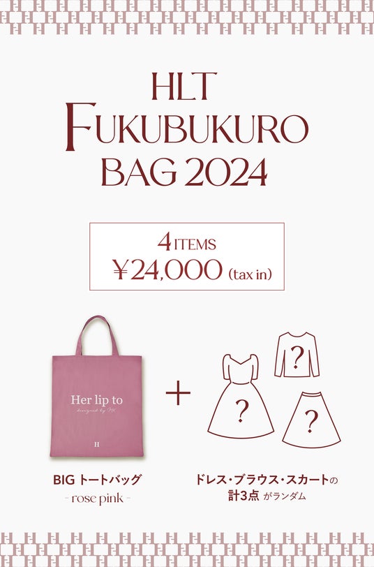 二つ目は、キャッチーなローズカラーのBIGトートに、これまでに登場したドレス・ブラウス・スカートが入った計4点のスペシャルな福袋「HLT “FUKUBUKURO” BAG 2024」が数量限定で登場。