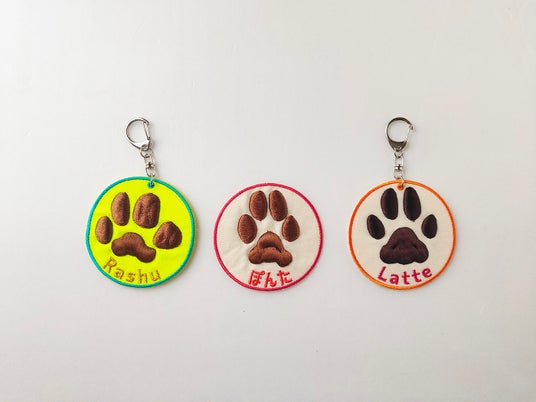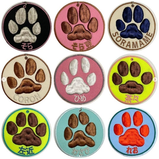 ワッペンやキーホルダーのデザインは、生地の色(8色)、フチの糸色(10色)、肉球の糸色(30色)、お名前の糸色(30色)、お名前の表記について、お選びいただけます。