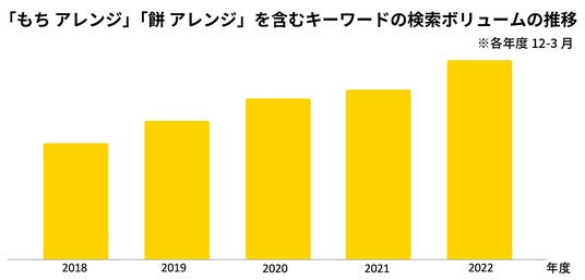 『DELISH KITCHEN』のアプリでは、毎年お正月明け~1月中旬頃をピークに「もち アレンジ」や「餅 アレンジ」を含むキーワードの検索ボリュームが増加します。また、各年度の平均検索ボリューム(12-3月)は2018年度から年々上昇しており、2022年度は2018年度の1.7倍にまで伸びています。