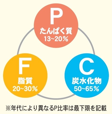 摂取エネルギーのうち、たんぱく質(P)・脂質(F)・炭水化物(C)のエネルギー産生栄養素がどれくらいの割合を占めているのかを示した比率です。厚生労働省では、「エネルギー産生栄養素バランス」として、生活習慣病の予防・改善の指標となる目標量を以下のように示しています。