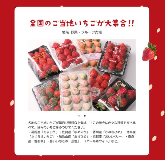 各地のご当地いちごが毎日12種類以上登場!!この機会に色々な種類を食べ比べて、好みのいちごをみつけてください。