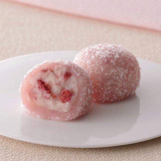 フリーズドライのいちごを散らしたみるく餡をいちご風味の求肥でつつみました。