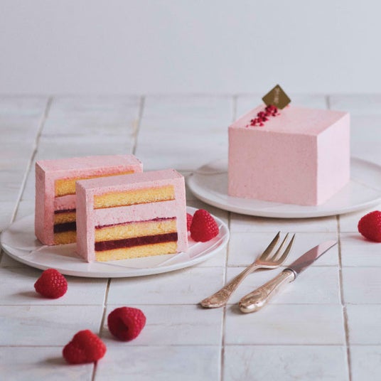 しっとりきめ細やかいスポンジを重ね、ラズベリーのバタークリームで包み、アクセントに甘酸っぱいラズベリージャムとストロベリージュレを挟みました。