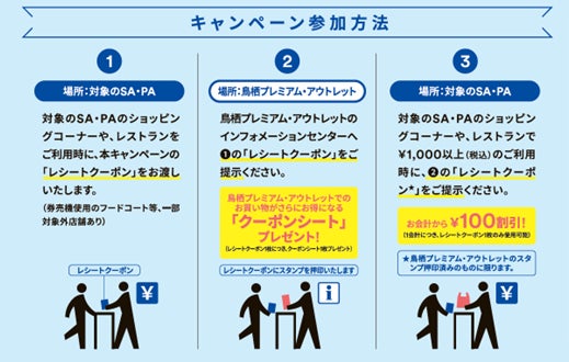 <STEP 3> お帰りの際に、対象のSA・PAのショッピングコーナーまたはレストランで、スタンプ押印済みのレシートクーポンを提示すると、1,000円以上のお買い物でお会計時に100円割引します。(1会計につき、レシートクーポン1枚のみ使用可能)