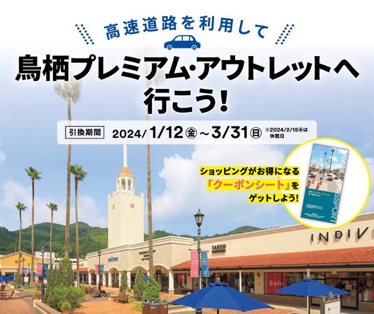 鳥栖プレミアム・アウトレット(所在地:佐賀県鳥栖市 運営:三菱地所・サイモン株式会社)は、西日本高速道路サービス・ホールディングス株式会社 九州支社(所在地:福岡県福岡市)と連携し、2024年1月12日(金)~3月31日(日)の期間、「高速道路を利用して鳥栖プレミアム・アウトレットへ行こう!」キャンペーンを開催します。