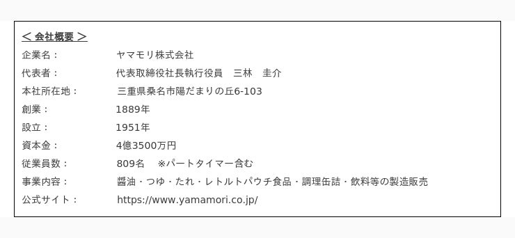 1889年三重県で創業し、今年で134年目の老舗の総合食品メーカーです。醤油醸造業としての祖業以来「変革への挑戦」を続け、様々な業界初の技術及びマーケティングの革新を通じて、変化する市場のニーズを常に汲んだ取り組みを行ってきました。膨大なレシピベースと経験が支える「おいしさ」を礎にした”エンターテインメント&健康”をコンセプトにした商品の開発でお客様のスマイルを創造する企業として活動しています。