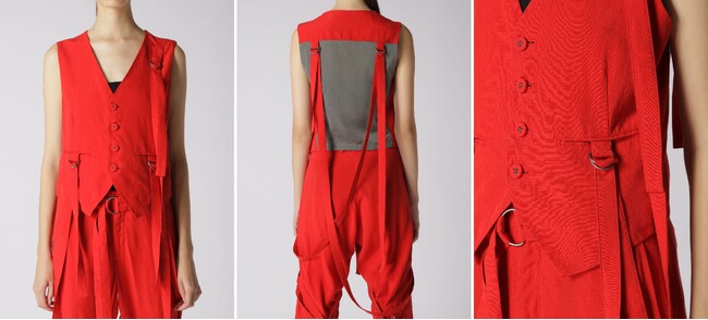 左ショルダーと両ポケットからロングドローコード、バックスタイルは赤×グレートのバイカラー