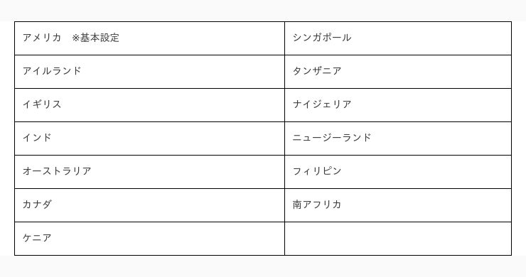 基本設定のアメリカを含めた、13か国の中から選択が可能。