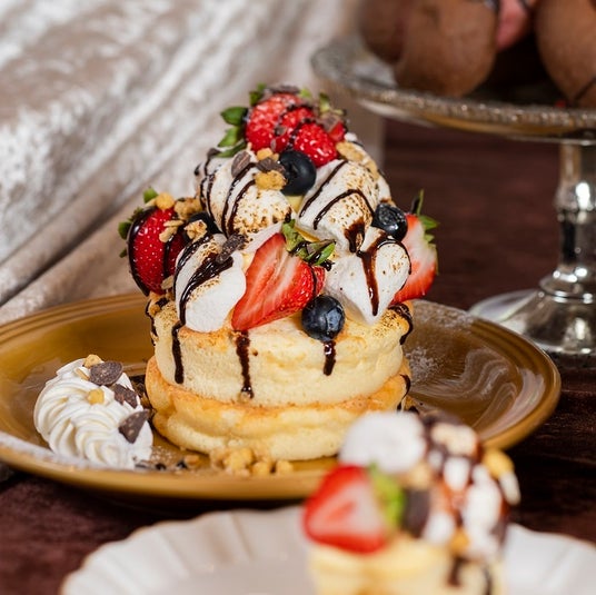 チョコレートラウンジ定番のパンケーキをマシュマロとチョコで冬らしくアレンジしました。