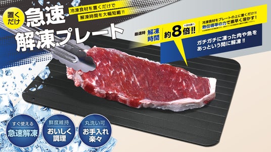 特徴:電子レンジの解凍ムラや粗熱取りの悩みを解決して料理の効率を大幅UP!凍った肉や魚をプレートに置くだけで最大8倍の解凍時間を実現。2枚使いで更に速く解凍することも可能です。熱伝導率に優れたアルミ素材のプレートがあなたの調理をアシストします!