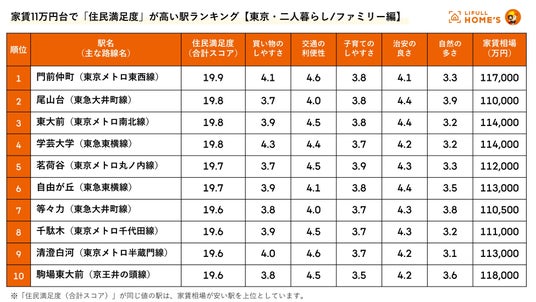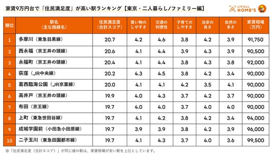 街の情報メディア『LIFE LIST』が、二人暮らし・ファミリー向けに“住民満足度”が高い東京の駅ランキングを家賃相場別に発表