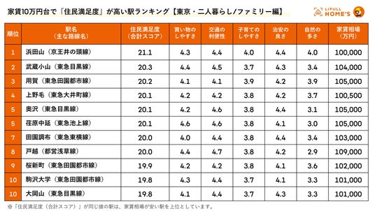 そこで「予算内でできるだけ住み心地のいい駅を選びたい」という二人暮らし・ファミリー層に向けて、LIFULL HOME’Sの街の情報メディア『LIFE LIST』が、家賃相場別に、実際にその街に暮らす人の「住民満足度(※2)」が高い駅ランキング化しました。