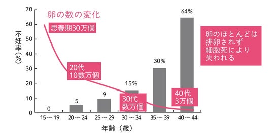 思春期に約30万個あった卵は、20代以降では減少の一途をたどり、加齢により染色体異常のリスクが高まり、卵の質も下がっていきます※。