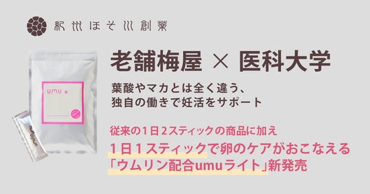 研究に基づいた「科学的根拠」と受け継がれてきた「伝統食材」に真剣に向き合う株式会社紀州ほそ川創薬では、医科大学と共同で研究し、「ウムリン」という梅の有用成分を開発し、妊活をサポートします。2024年1月15日、20代からの妊活中女性向けに、もっと手軽に卵のケアがおこなえる「ウムリン配合umuライト」を新発売しました。
