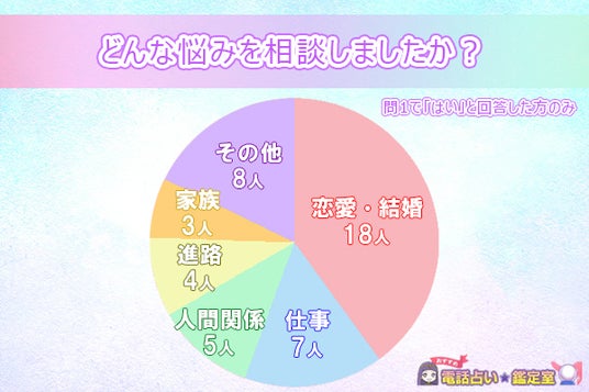 最も多かったのは「恋愛・結婚について」で18人、次いで「仕事について」が7人、「人間関係について」が5人、そして「進路について」が4人、「家族について」が3人、「その他」が8人でした。