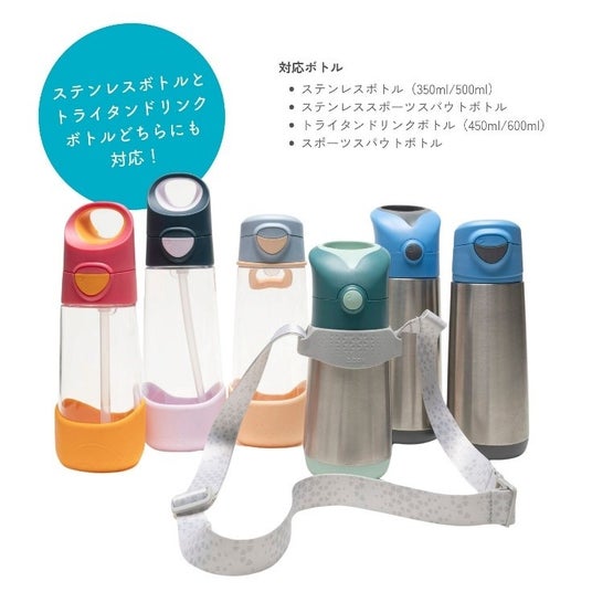 お子様とのおでかけや通園通学に便利な肩がけストラップ。丈夫で長さ調節ができるリサイクルポリエステル製のストラップです。ビーボックスのステンレスドリンクボトル、トライタンドリンクボトルのどちらにも対応します。
