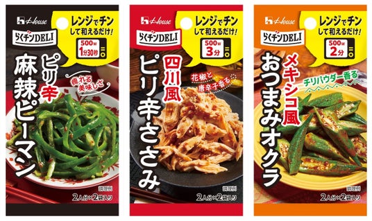 ハウス食品は、メニュー専用シーズニング「らくチンDELI」シリーズから、<麻辣ピーマン><ピリ辛ささみ><おつまみオクラ>の3アイテムを、2月12日からスーパーなどで発売します。「野菜」や「鶏肉」を材料に、電子レンジでチンして本製品を和えるだけで、家庭で簡単におつまみメニューを楽しむことができます。2人分×2袋、オープン価格(税別参考小売価格125円)。