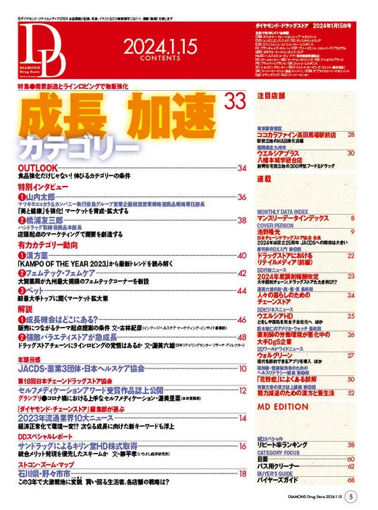 本特集では、マツキヨココカラ&カンパニー執行役員グループ営業企画統括営業戦略室商品戦略専任部長の山内太郎氏やハシドラッグ(福島県)の橋浦友三郎氏のインタビューのほか、今後の成長が期待できる3つのカテゴリーの最新動向、販売につながるテーマ起点提案の条件、ラインロビングについての解説を収録した。物販の成長のヒントになれば幸いです。