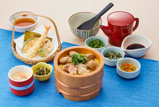瀬戸内産の牡蠣を使用した牡蠣ご飯、寒さわらのお刺身、たら白子・芽キャベツの天ぷらなど、旬の食材を盛り合わせて種類豊富に色々な旬の味覚を楽しめる和膳です。