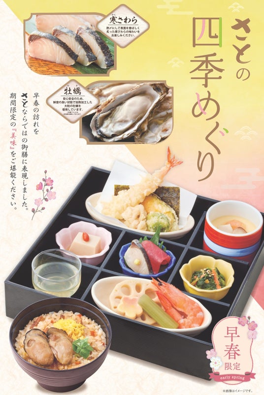 国内197店舗を展開する「和食さと」では、旬の食材「牡蠣」や、身が引き締まって脂乗りの良い「寒(かん)さわら」、そして、たらの白子など旬の海鮮食材をふんだんに使用した季節限定メニューを販売します。