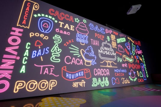 日本でもインスタ映えすると人気の高いネオンウォール。「うんこ」を様々な言語で書いています。