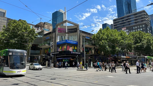 メルボルンの中心地であるパークストリートとスワンストリートが交差する「360 Bourke St.」。メルボルン国際空港(タラマリン空港/Melbourne Airport、MEL)からのシャトルバス「スカイバス(SkyBus)」の発着所サザンクロス駅の近くで、アクセスが良く、観光客、ビジネスマン、登下校の学生などが行き交う中心地です。