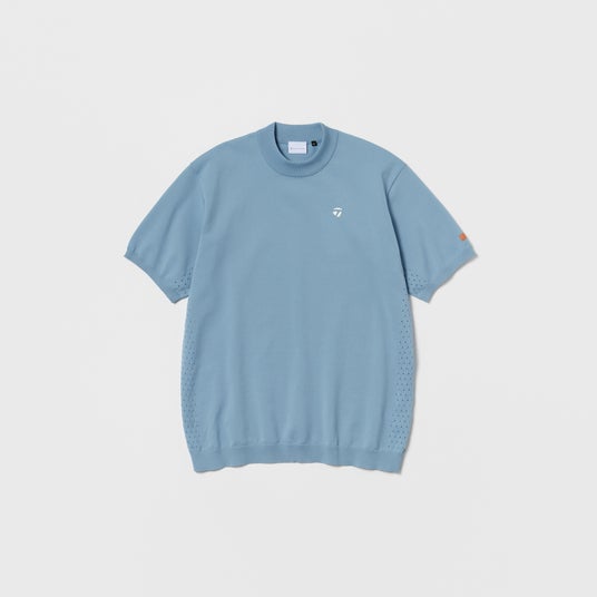 ポリエステル素材を使用した軽量ショートスリーブモックネックシャツ。背面にはTの文字が編地の違いでデザインされています。