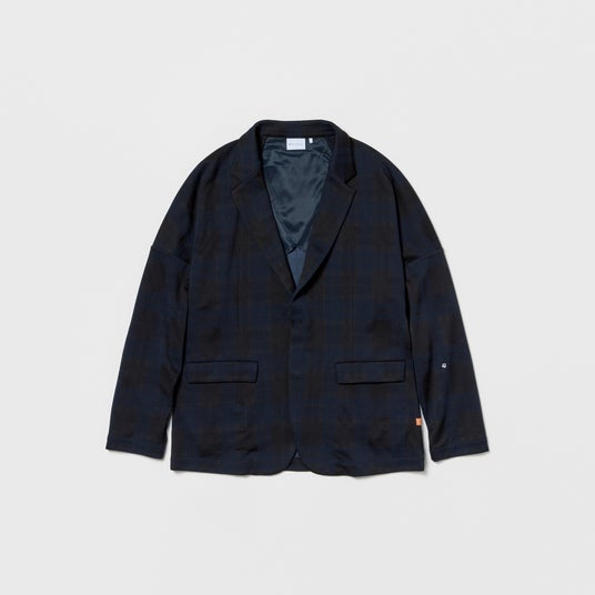 ダンボール素材を使用したテーラードジャケット。シーズンを象徴するタータンチェック柄が特徴的で背面に大きなブランドロゴ刺繍を配しています。
