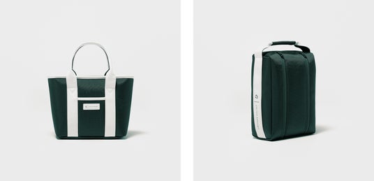 グリーンとホワイトのコントラストが映えるデザインにコラボレーションロゴがワンポイントになったシューズケース。ダブルファスナー仕様でシューズを片足ずつ収納可能です。