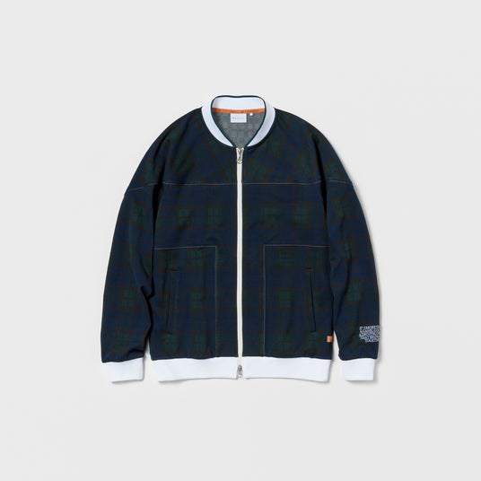 ダンボール素材を使用したフルジップジャケット。シーズンを象徴するタータンチェック柄で、前面のTの文字をイメージしたパイピングデザインが特徴。背面に大きなブランドロゴ刺繍を配しています。