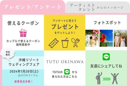 SmileTogetherには1.カップル応援メッセージはカップルで使えるクーポンや2.毎月当たるプレゼント、3.フォトスポット紹介、4.フェア紹介のご案内などのメニューを用意していますので是非沖縄リゾートウェディングカップルはご利用ください。