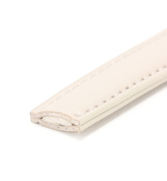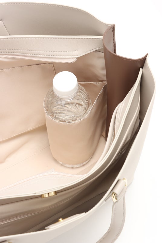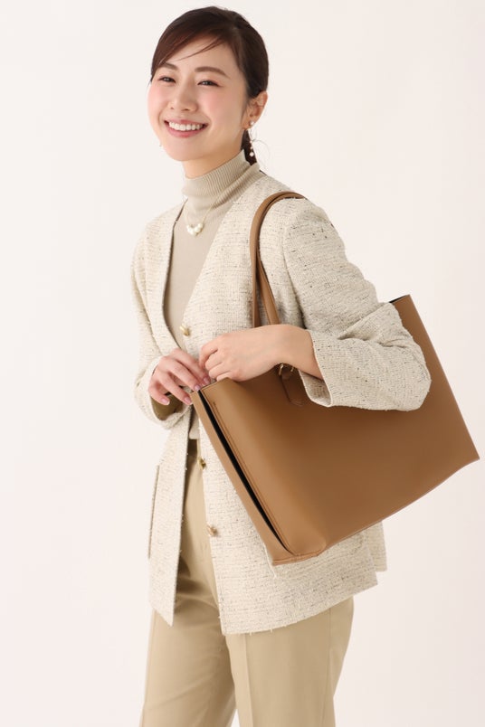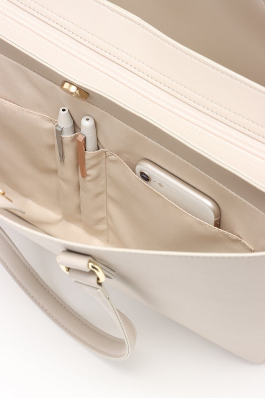 ビジネスシーンで人気のトートバッグですが、書類やPCなどを入れることも多く、「荷物が重くて肩が疲れる」というお客様の声が数多く寄せられました。そこで、華奢見えする持ち手の幅を維持しつつ、持ち手部分のクッション素材にはヨガマットなどに使われる柔らかくて弾力性のある素材を使用し、肩への負担を軽減。加えて、バッグ本体を一枚革仕立てにし、余分な金具やパーツを省いたシンプルなデザインにすることで当社従来比約10%の軽量化を実現しました。また、「荷物はたくさん入るけど、コンパクトに見せたい」という要望に対しては、A4サイズの書類やPCがすっぽり入り、弁当箱やペットボトルまでも収納できるようマチ幅を調節しました。さらに、サイドをバイカラーにすることで、デザイン性を持たせつつ、視覚的にもスッキリコンパクトに見えるようにしています。